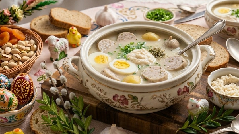 Barszcz biały z kiełbasą i chrzanem to jedna z najbardziej tradycyjnych zup wielkanocnych w polskiej kuchni. Przygotowywany jest na bazie zakwasu z mąki pszennej lub żytniej, który nadaje mu charakterystyczny lekko kwaśny smak. Do zupy dodaje się białą kiełbasę, która podczas gotowania oddaje swój aromat. Ważnym składnikiem jest także chrzan, który podkreśla smak zupy i dodaje jej lekkiej ostrości. Barszcz biały często podawany jest z jajkiem ugotowanym na twardo. Zupa jest sycąca i rozgrzewająca, dlatego świetnie sprawdza się podczas świątecznego śniadania. W wielu domach barszcz biały przygotowuje się według rodzinnych receptur. Jego smak można wzbogacić dodatkiem czosnku, majeranku oraz wędzonki. Dzięki temu zupa zyskuje głębszy aromat. Barszcz biały jest prosty w przygotowaniu, a jednocześnie bardzo tradycyjny. Idealnie komponuje się z pieczywem lub ziemniakami. Najlepiej smakuje świeżo po ugotowaniu, ale można go także odgrzać następnego dnia. To klasyczna potrawa, która kojarzy się z wielkanocnym stołem. Aromatyczna i pełna smaku zupa, którą warto przygotować na święta. To jedna z najpopularniejszych zup w polskiej kuchni wielkanocnej.
